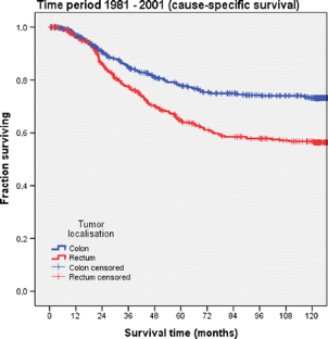 Stelzner S, Hellmich G, Koch R, Witzigmann H (2009) Exactitude of relative survival compared with cause-specific survival and competing risk estimations based on a clinical database of patients with colorectal carcinoma. Dis Colon Rectum 52(7):1264–1271