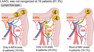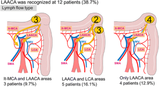 Thirty-one patients were enrolled in this study. The lymph flow was visualized in 31 patients (100 %) without any complications. No case exhibited lymph flow in both the left colic artery (LCA) and left branch of the middle colic artery (lt-MCA) areas. There were 19 cases (61.3 %) with lymph flow directed to the area of the root of the inferior mesenteric vein (IMV), regardless of the presence of the left accessory aberrant colic artery. Lymph node metastases were observed in six cases (19.4 %), and all of the involved lymph nodes existed in lymph flow areas determined by real-time indocyanine green fluorescence imaging.
