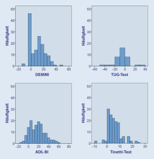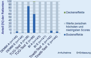 Es wurden 144 Patienten (Alter 84,91 Jahre [SD ±5,77 Jahre], 65,97 % weiblich) untersucht. Beim DEMMI wurden im Mittel 33,45 Punkte (SD ±15,37 Punkte) bei Aufnahme und 43,90 Punkte (SD ±15,55 Punkte) bei der Entlassung (jeweils n = 144) erreicht. Bodeneffekte beim TUG-Test wurden bei Aufnahme bei 84,72 % (n = 122) und bei der Entlassung bei 60,42 % der Patienten (n = 87) beobachtet. Keine Boden- oder Deckeneffekte zeigten hingegen DEMMI, Tinetti-Test und BI. Die Korrelation bei Aufnahme und Entlassung betrug zwischen DEMMI und TUG-Test −0,48 und −0,49, zwischen DEMMI und Tinetti-Test 0,75 und 0,82 sowie zwischen DEMMI und BI 0,54 und 0,66 jeweils mit p < 0,01.