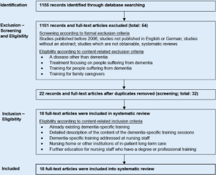 Es wurde eine systematische Literaturrecherche durchgeführt, um Studien, die demenzspezifische Weiterbildungen adressieren, zu finden. Die Datenbanken Embase, Medline, Cochrane, CINAHL, PsychINFO, PSYNDEX und ScienceDirect wurden durchsucht.
