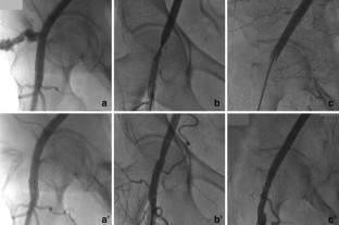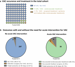 Only four patients (1.1 %) required surgical treatment for VAC. Percutaneous balloon angioplasty (PTA) or stent implantation was required for VAC in 44 patients (12.4 %). The technical success rate of percutaneous VAC treatment was 93 %. Four patients died within 30 days of VAC treatment, but only one fatality was directly attributable to VAC. Post procedure mean hospital stay was numerically prolonged by 2.4 days in the VAC treatment group (P = 0.06). During a median follow-up of 385 days (range 89–909 days) none of the patients were diagnosed with a late VAC or reported a new diagnosis or symptoms of perfusion deficit or peripheral artery disease.