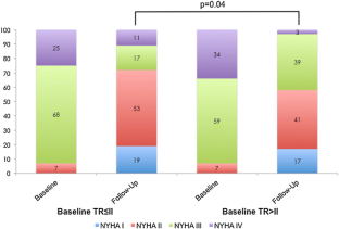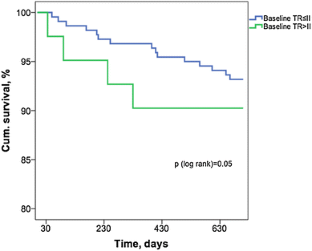 261 patients (mean age 76.6 ± 10, EuroScore 15.9 ± 15.1%) with symptomatic mitral regurgitation (MR) (75.2% functional MR) undergoing MitraClip procedure were included and followed for 721 ± 19.4 days. At baseline 54.7% presented with TR grade 0/I, 29.5% with grade II, 13.4% with grade III and 2.3% with grade IV. When dividing groups according to baseline TR grades, follow-up (FU)-NYHA class was significantly improved only in patients with TR ≤ II (p = 0.05). FU-6-min walking distance increased significantly in the overall cohort (p = 0.05), in patients with TR ≤ II (p = 0.007), but not in patients with TR > II (p = 0.4). Moreover, FU-NT-pro-BNP levels were higher in patients with TR > II (p = 0.05), compared to patients with TR ≤ II. There was a higher mortality according to baseline TR > II and multivariate Cox regression revealed TR > II as the strongest independent predictor for mortality (hazard ratio 2.04).