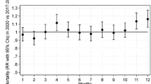 During the lockdown period, there was an increase in cardiovascular mortality, comprising cardiac death, pulmonary embolism, and stroke, of 7.6% (IRR 1.08, 95% CI 1.01–1.14; p = 0.02) (Fig. 1). Cardiac mortality increased by 11.8% (IRR 1.12, 95% CI 1.05–1.19; p < 0.001). The incidence of fatal pulmonary embolism increased by 10.6% (IRR 1.11, 95% CI 0.85–1.44; p < 0.46), although this change was without any statistical significance. In contrast, the number of patients who deceased due to stroke (IRR 0.79, 95% CI 0.66–0.94; p = 0.01) and other causes of death (IRR 0.91, 95% CI 0.87–0.95; p = 0.001) was lower during the lockdown period in 2020 (Table 1).