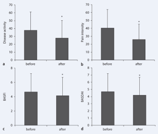 Gyurcsik ZN, András A, Bodnár N et al (2012) Improvement in pain intensity, spine stiffness, and mobility during a controlled individualized physiotherapy program in ankylosing spondylitis. Rheumatol Int 32:3931–3936