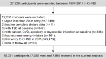For this study, participants were excluded when one of the following criteria was fulfilled: participants who withheld permission for linkage with disease registries (n = 1046); prevalent diabetes cases at baseline (n = 679); participants with missing information of dietary intake (n = 180) and other co-variables, such as education information and physical activity level, (n = 339); participants with implausible energy intake based on the ratio of reported energy intake to estimated basal metabolic rate, i.e., the top or bottom 0.5% of the ratio (n = 346); leaving a total of 37,421 men and women for analyses.