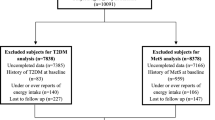 The proportional hazards assumption was tested by calculating Schoenfeld residuals and visual inspection of log–log plots, no deviation was detected. Interactions of total SFA intake (en%) with BMI categories (< 25.0, 25.0–29.9 and ≥ 30.0 kg/m2), family history of T2D (without family history and with family history), energy reporting status (mis-reporters and normal energy-reporters) and sex (men and women) were estimated using a likelihood ratio test and by including continuous interaction terms in the multivariable adjusted model (model 5). The analysis was repeated in the same population after excluding the first 2 years of follow-up to minimize the possibility of reverse causation. The analysis was also performed in the population after excluding prevalent cases of cancer or cardiovascular disease or hypertension or hyperlipidaemia and participants who had a stroke or myocardial infarction, due to their possible dietary changes caused by the illness. Furthermore, in additional analyses, we estimated the associations between non-SFA fatty acids derived from different food sources (per 1 SD of intake) and T2D risk, to see whether we can actually tease SFA apart from other fatty acids derived from the same food source in relation with T2D.