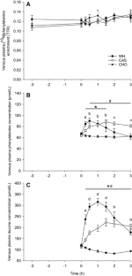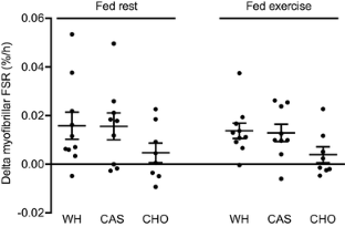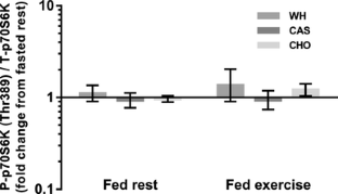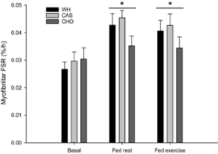 Insulin, phenylalanine, and leucine concentrations differed markedly after intake of the different study drinks. The basal FSR in WH, CAS, and CHO were 0.027 ± 0.003, 0.030 ± 0.003, and 0.030 ± 0.004%/h, the fed-rested FSR were 0.043 ± 0.004, 0.045 ± 0.003, and 0.035 ± 0.004%/h, and the fed-exercised FSR were 0.041 ± 0.004, 0.043 ± 0.004, and 0.034 ± 0.004%/h, respectively. No significant differences were observed at any state between the groups. Fed-rested- and fed-exercised FSR were higher than basal (P < 0.001). 3 h after exercise and feeding, no significant group differences were detected in the activity of p70S6K.