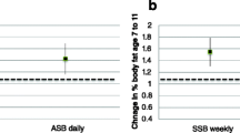 SSB consumption has previously been related to high BMI [15], particularly among adults aged under 45 years [16], which is supported by our results. Imamura et al. [12] conducted a meta-analysis of 17 studies comprising 38,253 cases with T2DM studied over 10,126,754 person years, mostly using food frequency questionnaires for dietary assessment. The positive association between SSB consumption and risk of T2DM was attenuated by BMI, indicated by a small reduction in relative risk from 1.18 (95% CI 1.09–1.28) to 1.13 (95% CI 1.06–1.21). Using our calculation method, this reduction represents 4.2% attenuation in the association between SSB and T2DM. Our present study found a little change after adjustment by BMI, WC (+ 4–6%) or estimated TATM (− 4%), but substantially greater attenuation by estimated BF% (-23%).