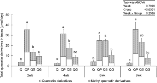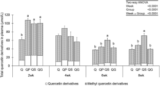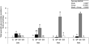 Male Wistar/ST rats were fed test diet containing 0.7% Q3GM with or without 5% of each dietary fiber for 8 weeks. Total quercetin derivatives were evaluated with liquid chromatograph tandem mass spectrometry (LC–MS/MS) as total quercetin derivatives after enzymatic deconjugation in plasma, urine, and fecal samples on week 2, 4, 6 and 8. Quercetin glucuronides excreted in feces were also measured.