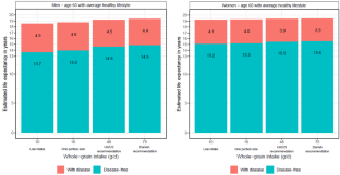 Based on information from 22,606 men and 25,468 women in the Danish Diet, Cancer and Health cohort, followed for an average of 13.8 and 17.5 years, respectively, a doubling in whole-grain intake was associated with 0.43 (95% CI: 0.33–0.52) and 0.15 (0.06–0.24) additional years without disease for men and women, respectively. Comparing the highest and lowest quartiles of whole-grain intake, with a special emphasis on men, we found that those with the highest intake lived, on average, one year longer without disease compared to those with the lowest intake. Additionally, although a high intake of whole grains yielded longer life expectancy, the duration of living with disease was shorter.