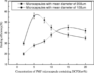 Microcapsules containing healing agents have been used to develop the self-healing polymeric composites. These microcapsules must possess special properties such as appropriate strength and stability in surrounding medium. A new series of microcapsules containing dicyclopentadiene (DCPD) with melamine–formaldehyde (MF) resin as shell material were synthesized by in situ polymerization technology. These microcapsules may satisfy the requirements for self-healing polymeric composites. The chemical structure of microcapsule was identified by using Fourier transform infrared (FTIR) spectrometer. The morphology of microcapsule was observed by using optical microscope (OM) and scanning electron microscope. Size distribution and mean diameter of microcapsules were determined with OM. The thermal properties of microcapsules were investigated by using thermogravimetric analysis and differential scanning calorimetry. Additionally, the self-healing efficiency was evaluated. The results indicate that the poly(melamine–formaldehyde) (PMF) microcapsules containing DCPD have been synthesized successfully, and their mean diameters fall in the range of 65.2∼202.0 μm when the adjusting agitation rate varies from 150 to 500 rpm. Increasing the surfactant concentration can decrease the diameters of microcapsules. The prepared microcapsules are thermally stable up to 69 °C. The PMF microcapsules containing DCPD can be applied to polymeric composites to fabricate the self-healing composites.