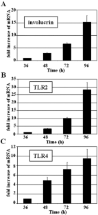 Toll-like receptors (TLRs) play an important role in the recognition of pathogens in keratinocytes. In this study, we investigated whether the differentiation state of HaCaT keratinocytes correlates with the expression of TLR2 and TLR4 genes. The expression levels of TLR2 and TLR4 in a HaCaT differentiation model system were determined using quantitative real-time RT-PCR (Q-RT-PCR) and flow cytometry. The progression of keratinocyte differentiation was monitored by determining the level of involucrin gene expression using Q-RT-PCR. The expression levels of TLR2 and TLR4 increased with the stage of differentiation and there were strong correlations between the expression level of the involucrin gene and those of the TLR2 gene (r=0.809, P<0.0001) and the TLR4 gene (r=0.568, P<0.02). Increased cell surface expression of TLR2 and TLR4 was also found in differentiated HaCaT keratinocytes by flow cytometric analysis. Our findings suggest that upregulation of TLR expression during differentiation in keratinocytes could be a part of the differentiation process of keratinocytes and could have biological significance in protecting skin against microbes.