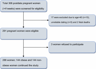 In this prospective cohort study, 144 obese (BMI > 30) and 144 non-obese (BMI < 29.9) post-term (> 41 weeks) pregnant women were recruited. IOL was done by misoprostol or amniotomy and oxytocin infusion according to the Bishop score. Comparison of percentage of failed IOL in both groups (primary outcome) was performed by the Chi-test. Logistic regression and multivariable regression were performed to assess the odds ratio (OR) of cesarean section (CS) and coefficient of delay in labor till vaginal delivery (VD) in obese versus (vs) non-obese groups. Adjustment for gestational age, parity, Bishop Score, membrane rupture and amniotic fluid index was done in both regression analyses.