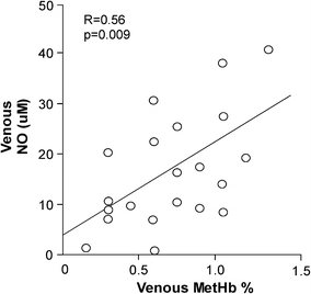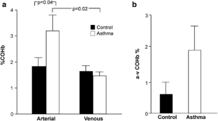 Nitric oxide (NO) and carbon monoxide (CO) are synthesized at high levels in asthmatic airways. NO can oxidize hemoglobin (Hb) to methemoglobin (MetHb). CO binds to heme to produce carboxyhemoglobin (COHb). We hypothesized that MetHb and COHb may be increased in asthma. COHb, MetHb, and Hb were measured in venous blood of healthy controls (n = 32) and asthmatics (n = 31). Arterial COHb and oxyhemoglobin were measured by pulse CO-oximeter. Hb, oxyhemoglobin, and deoxyhemoglobin were similar among groups, but arterial COHb was higher in asthmatics than controls (p = 0.04). Venous COHb was similar among groups, and thus, arteriovenous COHb (a-v COHb) concentration difference was greater in asthma compared with controls. Venous MetHb was lower in asthma compared to controls (p = 0.01) and correlated to venous NO (p = 0.009). The greater a-v COHb in asthma suggests CO offloading to tissues, but lower than normal MetHb suggests countermeasures to avoid adverse effects of high NO on gas transfer.