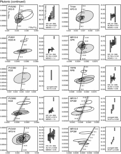 Figure SM3. Wetherill U–Pb concordia diagram of sensitive high-resolution ion microprobe-reverse geometry (SHRIMP-RG) data from a Proterozoic granite wall rock. Each data point is a single spot analysis. Ages on concordia are in Ma. The upper intercept date is based on regression of the full dataset, whereas the weighted mean 207Pb/206Pb date was calculated from the three most concordant analyses. The dashed lines are the uncertainty envelope on the regression line. Plot, weighted mean calculation, and linear regression were generated using the ET_redux software package (Bowring et al., 2011; McLean et al., 2011) (PDF 94 kb)