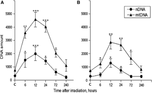 Evdokimovsky EV, Ushakova TE, Kudriavtcev AA, Gubina NE, Gaziev AI (2011) Alteration of mtDNA copy number, mitochondrial gene expression and extracellular DNA content in mice after irradiation. Radiat Environ Biophys 50:181–188