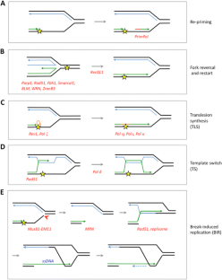 Vanoli F, Fumasoni M, Szakal B, Maloisel L, Branzei D (2010) Replication and recombination factors contributing to recombination-dependent bypass of DNA lesions by template switch. PLoS Genet 6, e1001205. doi:10.1371/journal.pgen.1001205