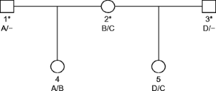 ). We also need to describe the founder alleles of the pedigree: These are maternal or paternal alleles whose relevant parent is not in the pedigree. First, there are founder alleles belonging to typed founders: Let g