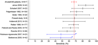 A positive MRZ reaction, defined as a positive intrathecal response to at least two of the three viral agents, was found in 78% of MS patients but only in 3% of the controls (p < 0.00001), corresponding to specificity of 97%. Median antibody index values were significantly lower in non-MS patients (measles, p < 0.0001; rubella, p < 0.006; varicella zoster, p < 0.02). The 30 identified original studies on MRZR reported results from 1478 individual MRZR tests. A positive MRZR was reported for 458/724 (63.3%) tests in patients with MS but only for 19/754 (2.5%) tests in control patients (p < 0.000001), corresponding to cumulative specificity of 97.5% (CI 95% 96–98.4), cumulative sensitivity of 63.3% (CI 95% 59.6–66.8) (or 67.4% [CI 95% 63.5–71.1] in the adult MS subgroup), a positive likelihood ratio of 25.1 (CI 95% 16–39.3) and a negative likelihood ratio of 0.38 (CI 95% 0.34–0.41). Of particular note, MRZR was absent in 52/53 (98.1%) patients with neuromyelitis optica or MOG-IgG-positive encephalomyelitis, two important differential diagnoses of MS.