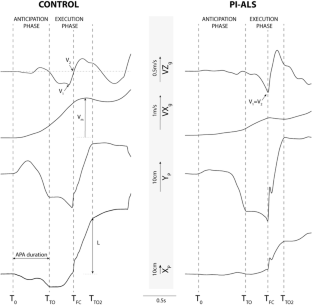 Parameters of gait initiation in the anticipatory postural adjustment phase (APA) and execution phase (EP) were evaluated in ALS patients with and without postural instability and healthy controls. Clinical and gait analysis parameters were interpreted in the context of brain imaging findings.