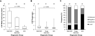 Jarius S, Ruprecht K, Wildemann B, Kuempfel T, Ringelstein M, Geis C, Kleiter I, Kleinschnitz C, Berthele A, Brettschneider J, Hellwig K, Hemmer B, Linker RA, Lauda F, Mayer CA, Tumani H, Melms A, Trebst C, Stangel M, Marziniak M, Hoffmann F, Schippling S, Faiss JH, Neuhaus O, Ettrich B, Zentner C, Guthke K, Hofstadt-van Oy U, Reuss R, Pellkofer H, Ziemann U, Kern P, Wandinger KP, Bergh FT, Boettcher T, Langel S, Liebetrau M, Rommer PS, Niehaus S, Munch C, Winkelmann A, Zettl UU, Metz I, Veauthier C, Sieb JP, Wilke C, Hartung HP, Aktas O, Paul F (2012) Contrasting disease patterns in seropositive and seronegative neuromyelitis optica: a multicentre study of 175 patients. J Neuroinflamm 9:14. https://doi.org/10.1186/1742-2094-9-14