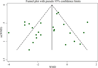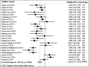 The literature searches of English publications in MEDLINE and EMBASE databases were performed up June 2020. Results were summarized as mean differences (MD) with 95% confidence intervals (CI) using random effects model (DerSimonian–Laird method). Heterogeneity among studies was evaluated by the Cochrane Q test and I-squared (I2). To determine the predefined sources of heterogeneity, subgroup analysis was performed.