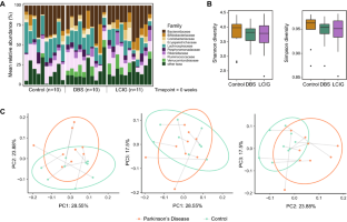 Clinical data and stool samples were collected from 21 PD patients initiating either deep brain stimulation (DBS) or levodopa–carbidopa intestinal gel (LCIG) and ten spousal healthy control (HC) subjects. 16S amplicon sequencing of stool DNA enabled comparison of temporal GM stability between groups and with clinical measures, including disease alterations relative to therapy initiation.