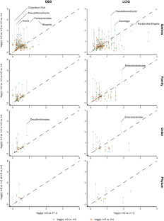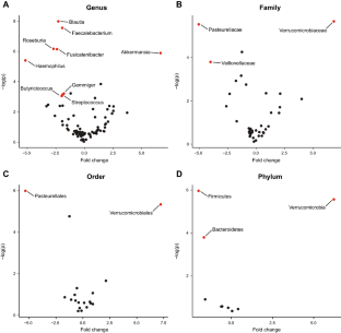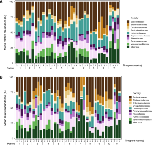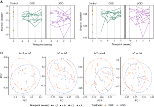We assessed GM response to therapy in the PD group by comparing pre-therapy (− 2 and 0 weeks) with post-therapy initiation timepoints (+ 2 and + 4 weeks) and HCs at baseline (0 weeks). Altered GM compositions were noted between the PD and HC groups at various taxonomic levels, including specific differences for DBS (overrepresentation of Clostridium_XlVa, Bilophila, Parabacteroides, Pseudoflavonifractor and underrepresentation of Dorea) and LCIG therapy (overrepresentation of Pseudoflavonifractor, Escherichia/Shigella, and underrepresentation of Gemmiger). Beta diversity changes were also found over the 4 week post-treatment initiation period.