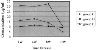 All eyes in groups A and B had PCO at 5–7 days, much earlier than in groups C, D and E. Two eyes in group C, three eyes in group D and six eyes in group E showed no signs of PCO throughout the 12-week study. The mean weight of wet posterior capsules from groups A–E was 157.919 mg, 160.091 mg, 81.114 mg, 71.827 mg and 19.984 mg respectively. The mean aqueous humor heparin level in groups C, D and E was 10.279 μg/ml, 13.246 μg/ml and 25.964 μg/ml respectively. Cell proliferation of the posterior capsules in group E was not active. The conjunctiva, cornea, iris, ciliary body and retina remained intact, and no significant toxic reactions were observed. No intraocular hemorrhage occurred during the follow-up.
