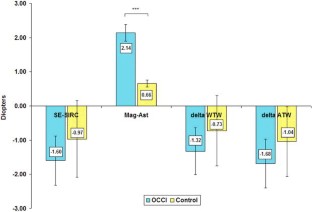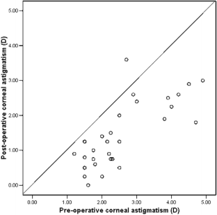 Using keratometric findings, mean astigmatism correction was 1.3 D (±0.9 SD; decreased from 2.6 D pre-operatively to 1.4 D post-operatively) in the OCCI group but only 0.4 D in the control group (P<0.005), 8 months post-operatively. Vector analysis of astigmatism correction showed greater change for OCCI patients (1.8 D vs 1.0 D, P=0.002). Using the Holladay method for calculating surgically induced refractive change (SIRC), the OCCI group showed a higher value of SIRC (−1.6 D vs −0.97 D), but this was not statistically significant. The OCCI patients showed a greater and significant change in refraction spherical equivalent than the controls. No complications related to OCCI or cataract surgery occurred during the follow-up period.