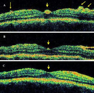 Atypical, 100 μm to 150 μm, greyish deposits appeared along retinal arteries and veins as well as on the vitreoretinal interface in the macula of a 44-year-old Caucasian woman while she was being treated for recurrent toxoplasmic chorioretinitis with antiparasitic drugs and subconjunctival injection of betamethasone. They disappeared progressively with the systemic use of corticosteroids. Their clinical course was nicely documented by optical coherence tomography.