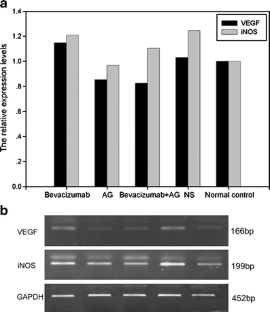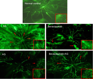 An OIR model was established with 7-day-old C57BL/6J mice. One day before and 1 and 3 days after being returned to the room air, the right eyes were injected intravitreally with bevacizumab, AG or bevacizumab+AG respectively. The left eyes were injected with normal saline (NS) as control. The mice were killed at postnatal day 17 (P17). The effects of AG or bevacizumab on iNOS or VEGF expressions were evaluated by RT-PCR and immunohistochemistry. Retinal NV was examined by fluorescein angiography, and was quantified histologically by CD34 immnunostaining at P17.