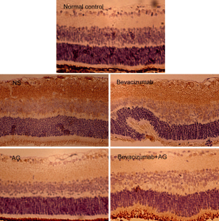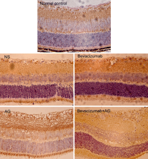 Compared with NS-treated eyes, retinal VEGF and iNOS mRNA expressions were significantly reduced in AG- and bevacizumab+AG-treated eyes; whereas in bevacizumab-treated eyes, retinal VEGF mRNA expression increased and iNOS mRNA expression remained unchanged. The above changes were confirmed by immunohistochemical study. The generalized decrease in both VEGF and iNOS distributions in mice retina treated with AG or bevacizumab+AG was demonstrated by immunohistochemistry. Retinal NV was significantly reduced in all three groups treated with bevacizumab, AG or bevacizumab+AG, when compared with NS-treated eyes.