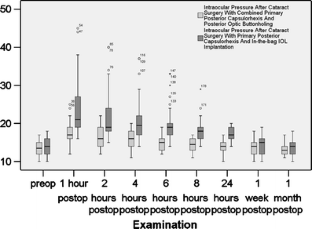 During the first 24 hours after surgery, all IOP measurements were significantly lower in eyes with combined PPC/POBH when compared to eyes with solitary PPC (p < 0.001). No IOP peaks of more than 27 mmHg were observed with combined PPC/POBH. In contrast, in eyes with PPC and in-the-bag IOL implantation, seven patients had an IOP peak of more than 27 mmHg and four IOP peaks of more than 30 mmHg. One week and 1 month postoperatively, IOP measurements were statistically comparable, and no significant differences could be observed between the two groups (p > 0.05).
