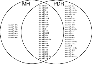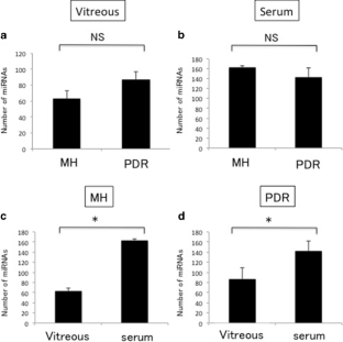 The mean number of miRNAs expressed in the vitreous was 63 (55–69) in eyes with MH and 86 (65–117) in eyes with PDR. The mean number of miRNAs expressed in the serum was 162 (159–167) in the MH patients and 142 (115–160) in the PDR patients. Twenty-six miRNAs were expressed in the vitreous of both MH and PDR eyes. Although there was no significant difference in the levels of 20 of the 26 (73 %) miRNAs expressed in both MH and PDR eyes, six of 26 miRNAs (24 %) (hsa-miR-15a, hsa-miR320a, hsa-miR-320b, hsa-miR-93, hsa-miR-29a, and hsa-miR-423-5p) were expressed significantly more highly in PDR eyes. In addition, the mean fold changes of three miRNAs, hsa-miR-23a, hsa-miR-320a, and hsa-miR-320b, in the vitreous to serum were significantly higher in the PDR group than in the MH group.