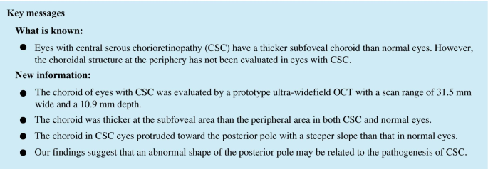 The choroid in CSC eyes has a steeper slope around the posterior pole. UWF-OCT can be used to evaluate the abnormalities of the choroidal structures from the posterior pole to the periphery in eyes with CSC.