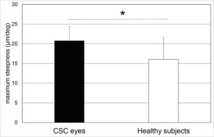We reviewed the medical records of 29 eyes of 25 patients (23 men, 2 women; average age 44.4 years) with CSC and 34 eyes of 22 healthy subjects (19 men, 3 women; average age, 49.5 years) with normal eyes. The images obtained by a prototype swept source UWF-OCT (Topcon, Tokyo, Japan) of about 31.5-mm wide and a depth of 10.9 mm were analyzed. The choroidal thickness was measured for each sector of the eye using the conventional automated layer analysis method. The local morphological differences were quantified by the maximum steepness (µm/deg) which was obtained by differentiating the changes in the choroidal thickness from the periphery to the fovea. Only the vertical scans were evaluated to avoid the influence of the optic disc.