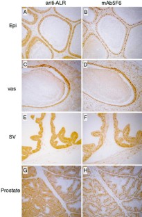 Carbonyl compounds, which are naturally produced and augmented under oxidative stress, have deleterious effects on the reproductive system. The aldo-keto reductase (AKR) family of enzymes catalyze the reductive detoxification of various carbonyl compounds in an NADPH-dependent manner. To elucidate involvement of AKR in detoxification of endogenously produced carbonyls in the male reproductive system, we investigated the differential expression and tissue localization of aldehyde reductase (ALR) and protein adducts produced by reaction with lipid peroxidation products. A strong immunoreactivity to an anti-ALR antibody was observed in the epithelia of the epididymis, vas deferens, seminal vesicle, and prostate gland. Virtually the same cells were stained with a monoclonal antibody (mAb) 5F6, raised against an acrolein-modified protein. In the testis, however, mAb5F6 specifically stained the nuclei of somatic cells and less differentiated spermatogenic cells. While acrolein inactivated glutathione reductase, an enzyme involved in recycling oxidized glutathione, AKR activity was affected at the high concentration only. The colocalization of lipid peroxidation products and AKR in the epithelia of the male genital tract indicates that these tissues are exposed to oxidative stress and possess a protective system coordinately.