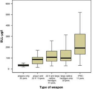 While individuals shooting only with airguns (n = 20) showed a median BLL of 33 μg/l (range 18–127 μg/l), those who were also users of .22 lr weapons (n = 15) turned out to have a median of 87 μg/l (range 14–172 μg/l). Shooters of .22 lr and large calibre handguns (9 mm or larger) (n = 51) had median 107 μg/l (range 27–375 μg/l) and those only using large calibre handguns (n = 32) had median 100 μg/l (range 28–326 μg/l). The IPSC-group (n = 11) had the highest median with 192 μg/l (range 32–521 μg/l).