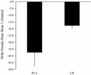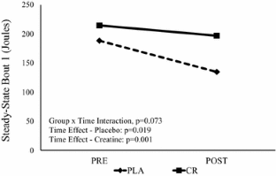No significant group × time interaction effects were found for work or power throughout all exercise bouts. Total work was significantly reduced over time in both groups (p = 0.049) during the incremental exercise bout. Work production in CL1 tended (p = 0.073) to attenuate in the CR group, compared to PLA. No changes were observed in CL2. Baseline PCr significantly decreased with casting in PLA (PRE: 26.6 ± 6.3 vs. POST: 22.5 ± 5.6 mM kg−1 wet muscle, p = 0.003). No change (p = 0.31) was observed in the CR group. Changes in work production were significantly correlated with changes in resting PCr in CR (r = −0.63, p = 0.021) but not PLA (r = −0.36, p = 0.26) group.