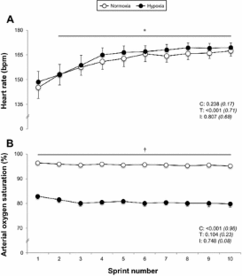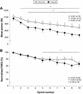 The 10 sprints in HY were associated with lower arterial oxygen saturation values compared to NM [80.7 ± 0.9 vs. 95.6 ± 0.6%; P < 0.001; effect size (ES) = 0.98], higher blood lactate values (11.9 ± 0.4 vs. 9.9 ± 0.9 mmol L−1; P = 0.05; ES = 0.36), and greater exercise-related sensations (~36%; P < 0.001; ES > 0.47). Mean power for sprints 1–10 were lower (−13 ± 3%; P = 0.001; ES = 0.79), and sprint decrement was more pronounced in HY compared to NM (21.4 ± 3.7 vs. 13.2 ± 2.7%; P = 0.003). There was a 17% decrease in RMS EMG activity from the first to the last sprint (P < 0.001; ES = 0.65), independent of condition (P = 0.597; ES = 0.04).