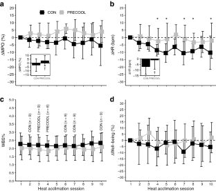 Changes in mean power output (∆MPO, P = 0.024) and heart rate (∆HR, P = 0.029) during heat acclimation were lower for CON (∆MPO − 2.6 ± 8.1%, ∆HR − 7 ± 7 bpm), compared with PRECOOL (∆MPO + 2.9 ± 6.6%, ∆HR − 1 ± 8 bpm). HR during constant-paced cycling was decreased from the pre-acclimation test in both groups (P < 0.001). Only PRECOOL demonstrated lower rectal temperature (Tre) during constant-paced cycling (P = 0.002) and lower Tre threshold for sweating (P = 0.042). However, skin perfusion and total sweat output did not change in either CON or PRECOOL (all P > 0.05). MPO (P = 0.016) and finish time (P = 0.013) for the 20-km TT were improved in PRECOOL but did not change in CON (P = 0.052 for MPO, P = 0.140 for finish time).