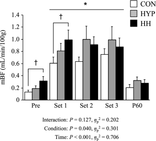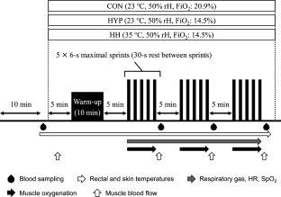 In a single-blind, cross-over research design, 11 active males performed three sets of 5 × 6-s maximal sprints with 30-s active recovery on a cycling ergometer under control (CON; 23 °C, 50% rH, 20.9% FiO2), normobaric hypoxic (HYP; 23 °C, 50% rH, 14.5% FiO2), or hot + normobaric hypoxic (HH; 35 °C, 50% rH, 14.5% FiO2) conditions. The vastus lateralis muscle blood flow after each set and muscle oxygenation during each sprint were evaluated using near-infrared spectroscopy methods.