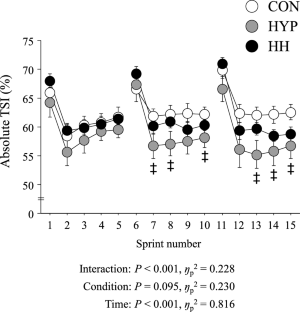 Despite similar repeated-sprint performance among the three conditions (peak and mean power outputs, percent decrement score), HH was associated with significantly higher muscle blood flow compared with CON after the first set (CON: 0.61 ± 0.10 mL/min/100 g; HYP: 0.81 ± 0.13 mL/min/100 g; HH: 0.99 ± 0.16 mL/min/100 g; P < 0.05). The tissue saturation index was significantly lower in HYP than in CON during the latter phase of the exercise (P < 0.05), but it did not differ between HH and CON.