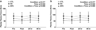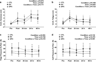 Thirty healthy, active males (23 ± 3 years; 180.2 ± 9.0 cm; 81.6 ± 11.3 kg) performed 100 drop jumps from a 0.6 m box followed by a randomized, single 30 min treatment of either a partial lower leg EPC device worn below the knee and above the ankle (110 mmHg), SC garment (20–30 mmHg) covering the foot and calf just below the knee, or no treatment CTL, and then returned 24 and 48 h later. Participants were assessed for measures of muscle soreness, fatigue, hemodynamics, blood lactate, muscle thickness, circumferences, and performance assessments.