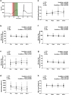 The drop jump protocol significantly increased muscle soreness (p < 0.001), fatigue (p < 0.001), blood flow (p < 0.001), hemoglobin (p < 0.001), and muscle oxygen saturation (SMO2; p < 0.001). Countermovement jump and squat jump testing completed after treatment with either EPC, SC, or CTL revealed no differences for jump height between any condition. However, EPC treatment maintained consistent braking force and propulsive power measures across all timepoints for countermovement jump testing. EPC and SC treatment also led to better maintenance of squat jump performance for average relative propulsive force and power variables at 24 and 48 h compared to CTL.