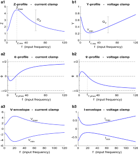 where \( \omega \) is the frequency (a linear function of the input frequency f). In I-clamp \(A_I = A_\mathrm{in}\) and \( A_V = A_\mathrm{out} \), while in V-clamp \(A_I = A_\mathrm{out}\) and \( A_V = A_\mathrm{in} \). Typically, \( A_\mathrm{in} \) is independent of \( \omega \), but this need not be the case. Note that Eqs. (40) are forced 3D and 2D linear systems in I- and V-clamp, respectively.