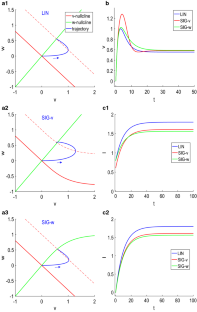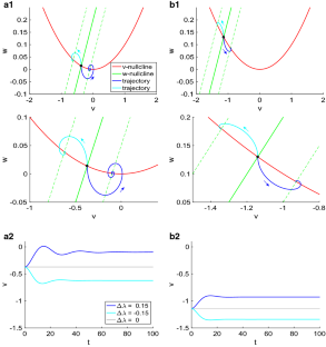 $$\begin{aligned} \left\{ \begin{array}{ll} v' = a v + b w + \epsilon \sigma _v v^2 + I_\mathrm{in}(t), \\ w' = c v + d w + \epsilon \sigma _v v^2, \end{array} \right. \end{aligned}$$