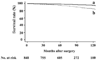 Death related to recurrence occurred in only eight patients (0.9%). Hematogenous metastasis to the liver or bone represented the most common pattern of recurrence, developing in six of the eight recurrences (75%). The 5-year and 10-year cancer-related survival rates were 98.6% and 94.8%, respectively. The 5-year and 10-year overall survival rates were 95.2% and 85.0%, respectively. Lymph node metastasis represented an independent prognostic factor when analyzed on the basis of cancer-related survival.