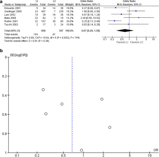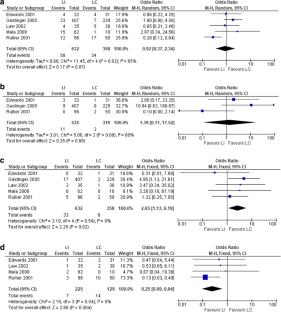 Six studies (two randomized controlled trials and four observational studies) totaling 1063 patients (666 LI and 397 LC) were included in the meta-analysis. Overall morbidity rate after both stoma creation and closure was 15.6% in LI vs. 20.4% in LC [OR(95%CI) = 0.67 (0.29, 1.58); p = 0.36] [NNT(95%CI) = 21 (> 10.4 to benefit, > 2430.2 to harm)]. Morbidity rate after stoma creation was both statistically and clinically significantly lower after LI [18.2% vs. 30.6%; OR(95%CI) = 0.42 (0.25, 0.70); p = 0.001; NNT(95%CI) = 9 (4.7, 29.3)]. Dehydration rate was 3.1% (8/259) in LI vs. 0% (0/168) in LC. The difference was not statistically or clinically significant [OR(95%CI) = 3.00 (0.74, 12.22); p = 0.13; NNT (95%CI) = 33 (19.2, 101.9)]. Ileus rates after stoma closure were significantly higher in LI as compared to LC [5.2% vs. 1.7%; OR(95%CI) = 2.65 (1.13, 6.18); p = 0.02].